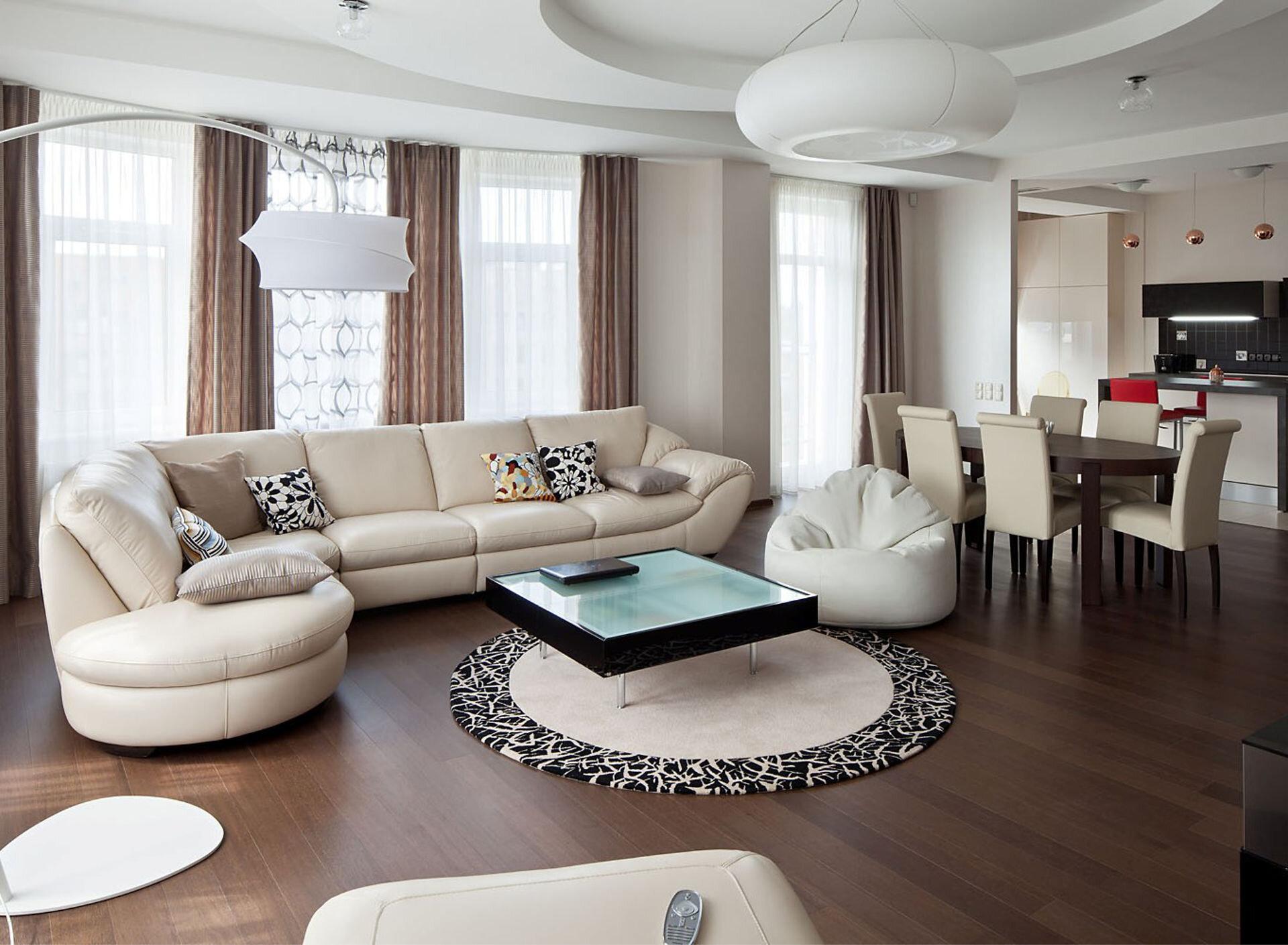 Он проявляется, в первую очередь, в правильном подборе мебели. Главное — это не перегружать комнату лишними деталями, тогда дизайн-проект гостиной станет успешным. Современная люстра позволяет сделать гостиную более интересной. Светильный прибор замечательно сочетается со следующими деталями: мягким диваном, который является центром