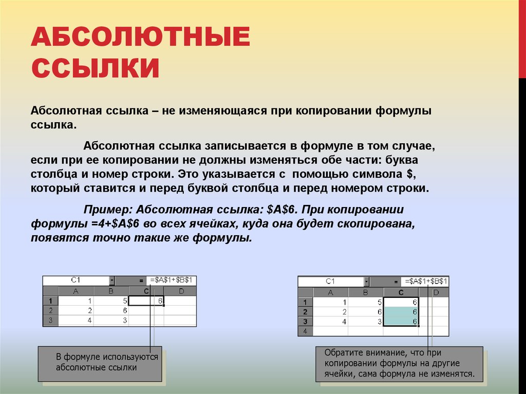 относительные ссылки, которые при копировании или перемещении ячейки с формулой ссылаются на другие ячейки относительно позиции ячейки с формулой;