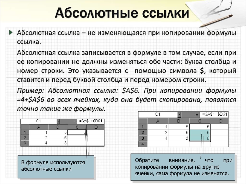 Абсолютные ссылки не изменяются при копировании формулы, а относительные ссылки адаптируются. Если у вас есть следующая формула в ячейке A1: