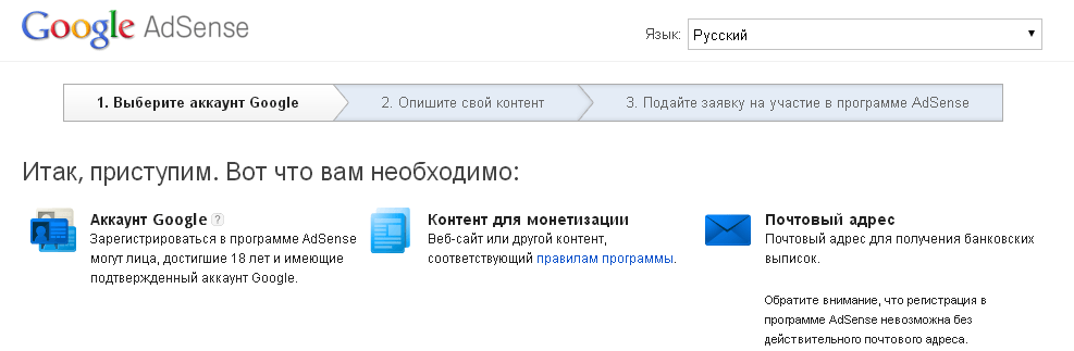 - ΠΠ΅ΡΠ΅ΠΉΡΠΈ ΠΏΠΎ ΡΡΡΠ»ΠΊΠ΅ google.ru/adsense/start.