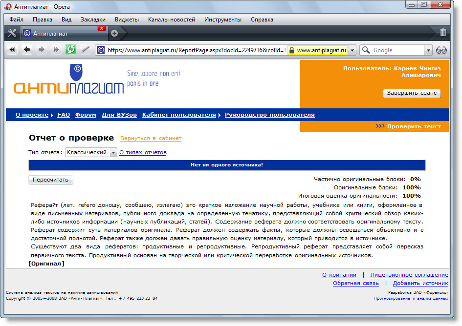 ru). На форуме этого сайта можно найти исчерпывающие сведения о работе этой программы и множество отзывов. Вопросов по работе антиплагиата больше не останется. После проверки текста этой программой выдается отчет, со списком ссылок, в которых обнаружено заимствование. И в каждом отчете крупными буквами вверху страницы написано: «Уважаемый пользователь! Обращаем ваше внимание, что система Антиплагиат отвечает на вопрос, является ли тот или иной фрагмент текста заимствованным или нет. Ответ на вопрос, является ли заимствованный фрагмент именно плагиатом, а не законной цитатой, система оставляет на ваше усмотрение. Также важно отметить, что система находит источник заимствования в своей базе, но не определяет, является ли он первоисточником». То есть, еще раз отметим, что программа антиплагиата показывает лишь заимствованный текст и не важно откуда он — из книги, учебника, монографии, статьи, готовых рефератов или дипломов.