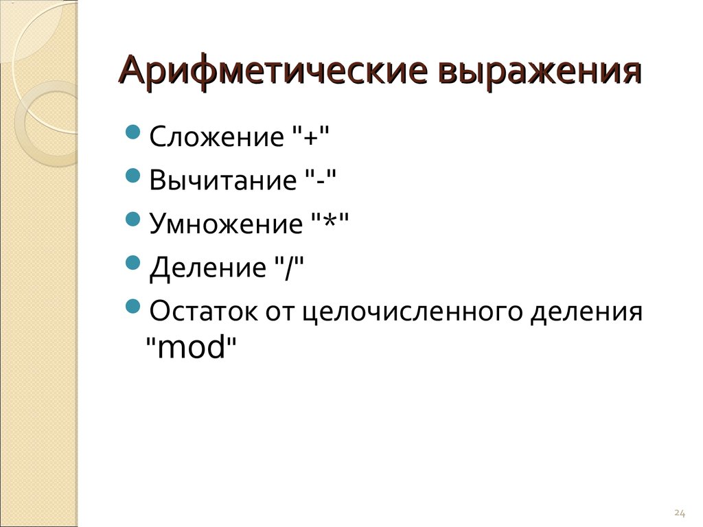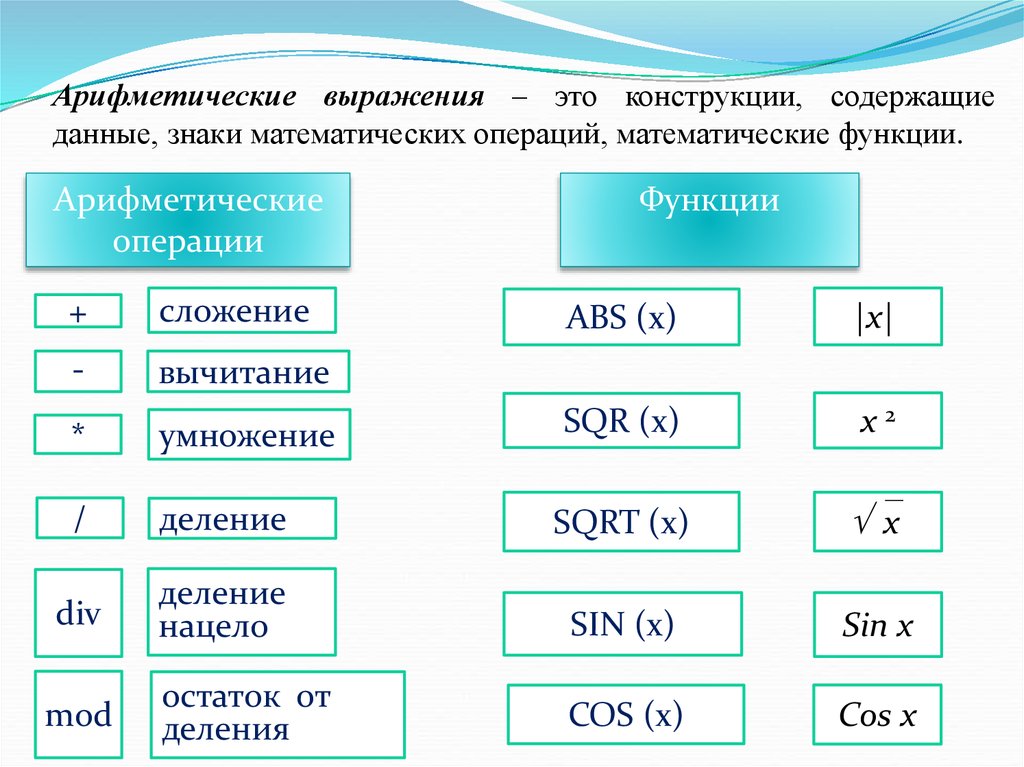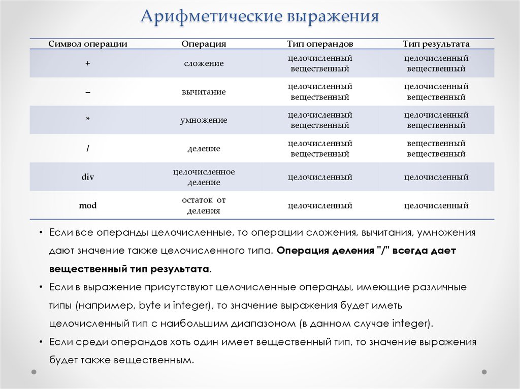 Π ΡΡΠΎΠΌ Π΄ΠΎΠΊΡΠΌΠ΅Π½ΡΠ΅ ΠΎΠΏΠΈΡΠ°Π½Ρ Π°ΡΠΈΡΠΌΠ΅ΡΠΈΡΠ΅ΡΠΊΠΈΠ΅ ΠΎΠΏΠ΅ΡΠ°ΡΠΎΡΡ, ΠΊΠΎΡΠΎΡΡΠ΅ ΠΏΠΎΠ΄Π΄Π΅ΡΠΆΠΈΠ²Π°ΡΡΡΡ Π² Π²ΡΡΠ°ΠΆΠ΅Π½ΠΈΡΡ . ΠΡΠ΅ ΠΎΠ½ΠΈ ΡΠ°Π±ΠΎΡΠ°ΡΡ Ρ ΡΠΈΡΠ»ΠΎΠ²ΡΠΌΠΈ ΡΠΈΠΏΠ°ΠΌΠΈ Π΄Π°Π½Π½ΡΡ (Integer/Long ΠΈ Decimal).