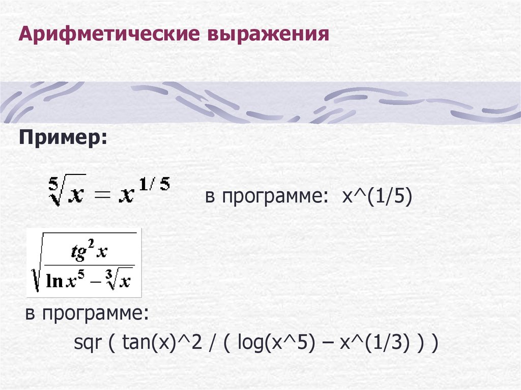 ΠΡΠΈΡΠΌΠ΅ΡΠΈΡΠ΅ΡΠΊΠΈΠ΅ Π²ΡΡΠ°ΠΆΠ΅Π½ΠΈΡ Π·Π°ΠΏΠΈΡΡΠ²Π°ΡΡΡΡ ΠΎΠ΄Π½ΠΎΡΡΠ°ΠΆΠ½ΠΎ. ΠΠ°ΠΏΡΠΈΠΌΠ΅Ρ, 0.35+Π°*2-cos(b)/(PI+2).