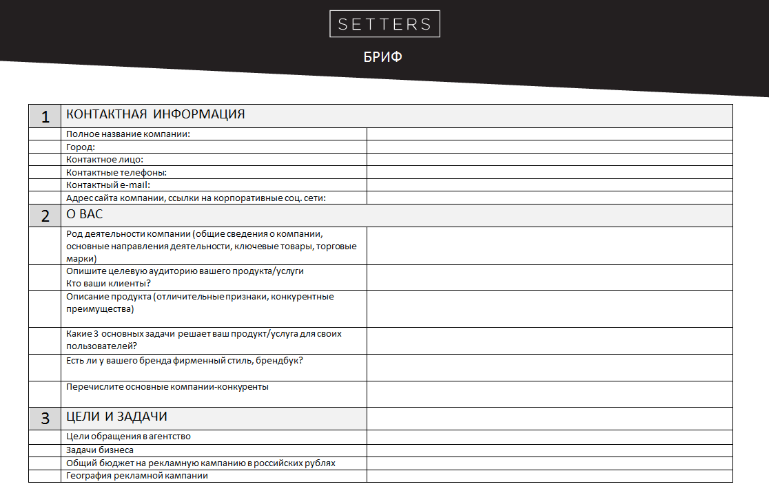 Главная задача этого документа – определить Ваши пожелания и требования. Можете поверить моему опыту, Время, потраченное на детальное заполнение анкеты, с лихвой окупится, сократит сроки согласований и позволит более точно оценить сроки и стоимость работ.