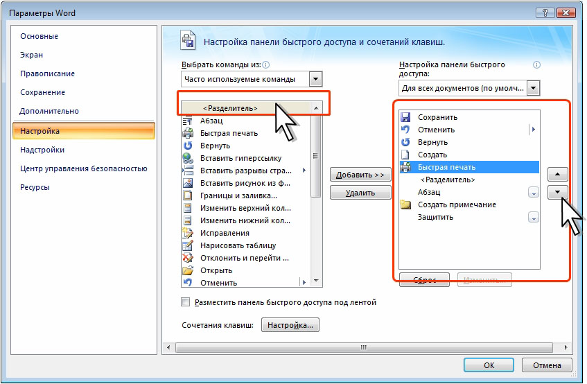 Кнопка быстрой печати. В правой части панели инструментов нажмите кнопку «Настроить панель быстрого доступа», а затем включите
