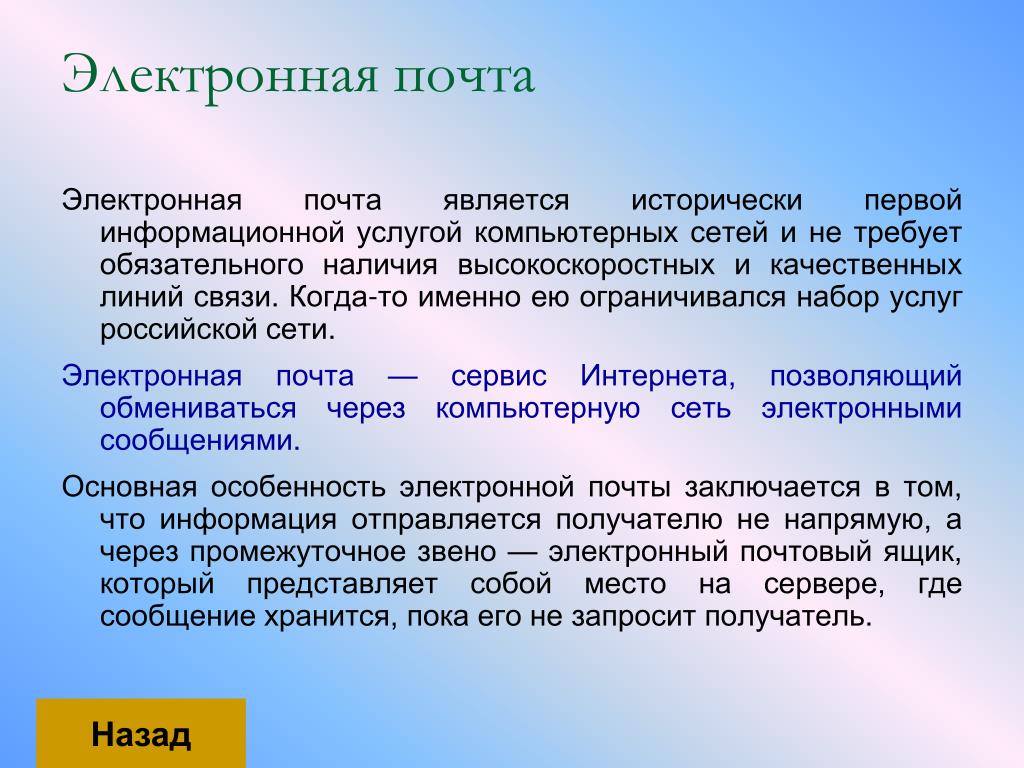 Электронная почта (email) — это механизм обмена электронными сообщениями между абонентами компьютерной сети.