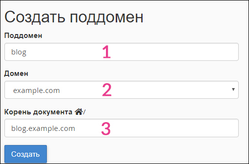 - В специальное поле вводим имя будущего поддомена. Затем нажимаем на кнопку «Создать»: