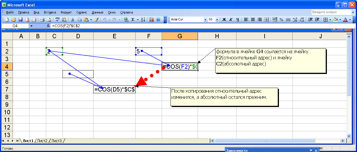 Каждый раз, когда формула с относительными ссылками переносится в другую ячейку, ссылки автоматически меняются.