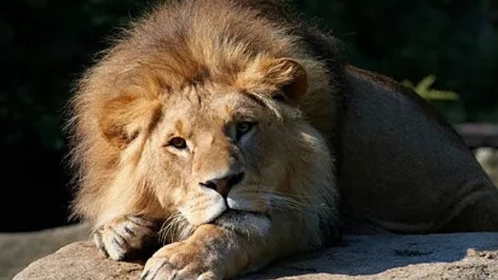 Взрослый самец льва отдыхает на африканском солнце. Только взрослые самцы имеют гриву, ерши из длинных густых волос. Чем крупнее грива, тем внушительнее лев выглядит для других самцов.