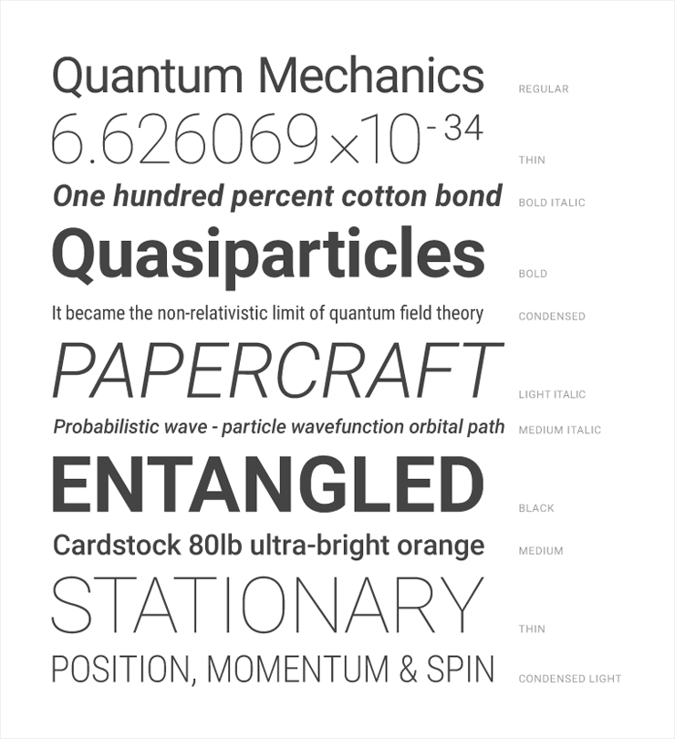 Roboto содержит полный набор значений веса шрифта (включая обычный, полужирный, курсив и полужирный курсив) и используется в основном для системных приложения и все приложения Google.