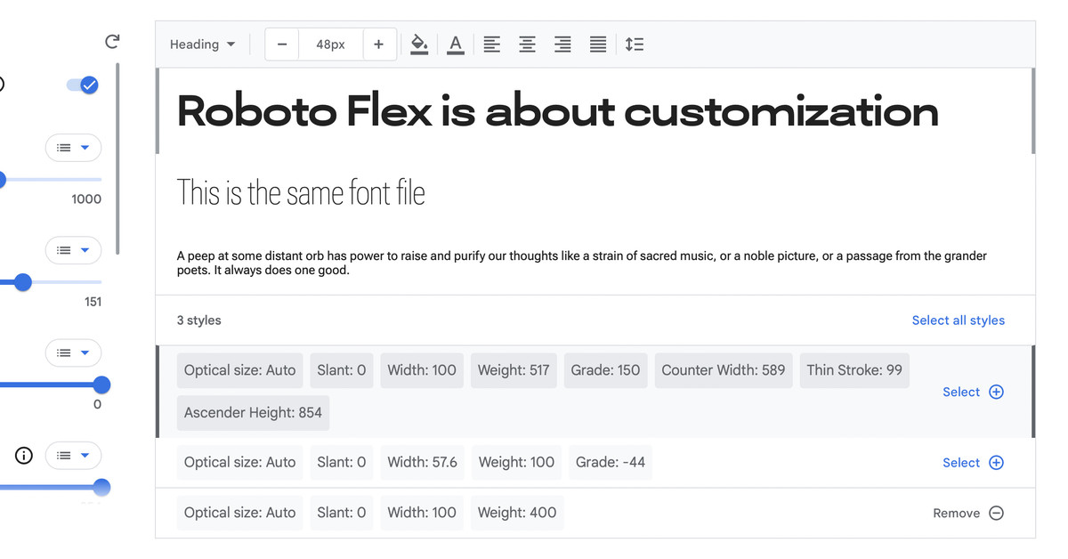 Roboto Flex — это переменный шрифт, который включает в себя довольно гибкую кастомизацию: