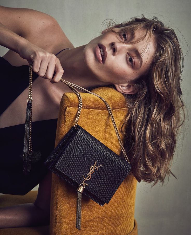 На этой неделе модель была замечена в Лос-Анджелесе после фотосессии в одних босоножках на каблуке, черных колготках Calzedonia и классическом темно-синем вязаном свитере с круглым вырезом. Весь образ, в том числе открытая деталь нижнего белья, был только что снят с подиума Bottega Veneta весна-лето 2023 и был дополнен одной из сумок Sardine Bags с латунной ручкой за 4200 долларов и охапкой желтых подсолнухов.