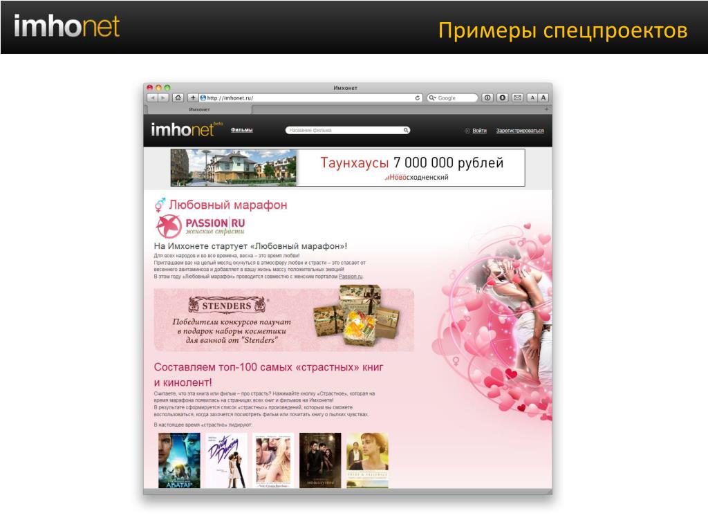 Imhonet.ru — один из самых популярных рекомендательных сервисов в России. Мы предоставляем рекомендации на основе совместной фильтрации фильмов, сериалов, книг и игр для конечных пользователей. Наша мультимедийная база — одна из крупнейших в Рунете. Аудитория — 15 миллионов уникальных посетителей в месяц. Рекомендательная система является активной областью исследований в области интеллектуального анализа данных и машинного обучения.