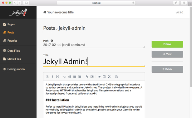 Первое, чем Jekyll отталкивает большинство начинающих: полное отсутствие визуального (WYSIWYG) редактора. Это сознательный отказ, а не техническая недоработка. Для оформления своих постов предлагается использовать языки Markdown и Textile, которые являются хорошо читаемыми даже в исходниках языками разметки. И с помощью этого реализуется более важный для «сферических пользователей Jekyll в вакууме» принцип написания постов: WYSIWYM, what you see is what you mean (видите то, что имеете в виду), для чего подойдёт любой текстовый редактор, хоть в терминале.