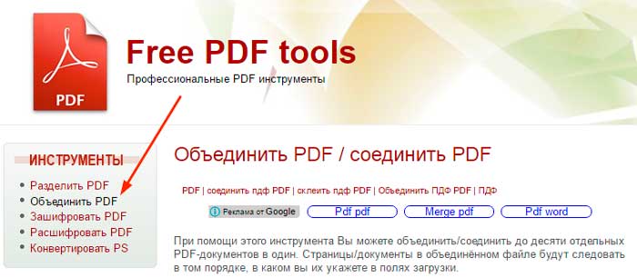 PDF2Go позволяет объединять PDF-документы, не занимая места на диске.