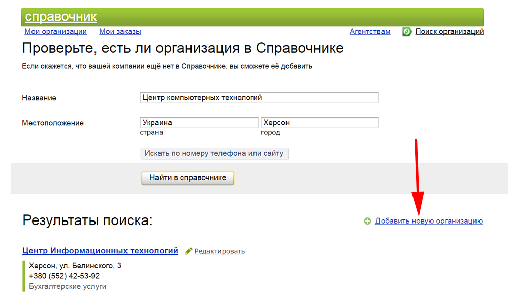На главное странице справочника будет кнопка «Добавить организацию», которая приведёт нас на страницу формы для заполнения. В поля нужно добавить информацию о названии, адресе, указать телефон для связи.