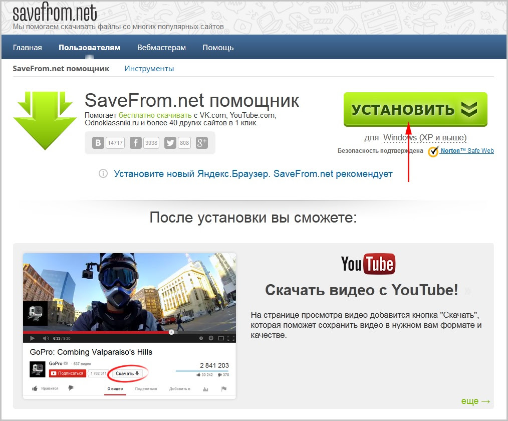 Для установки нужно перейти на онлайн-ресурс https://ru.savefrom.net/ и нажать кнопку «Установить».