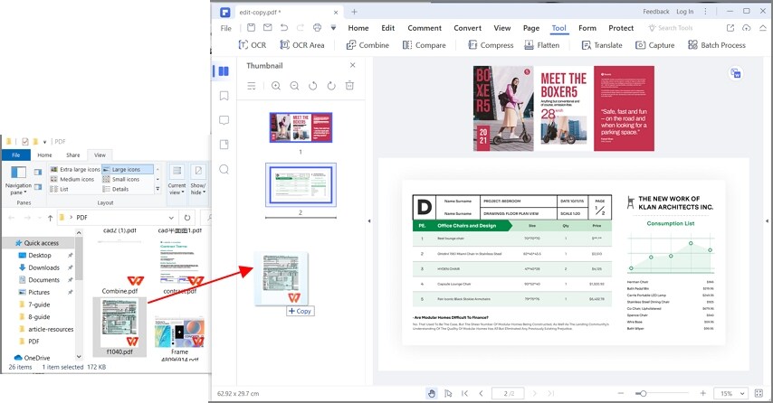 При объединении файлов вы можете указать диапазон страниц, которые вы хотите импортировать, но вы также можете точно настроить комбинацию, открыв несколько файлов на отдельных вкладках в редакторе PDF-XChange и перетащив эскизы нужной страницы из исходную вкладку на целевую вкладку (если эскизы не отображаются, нажмите Ctrl-T или используйте меню «Вид» > «Панели»).