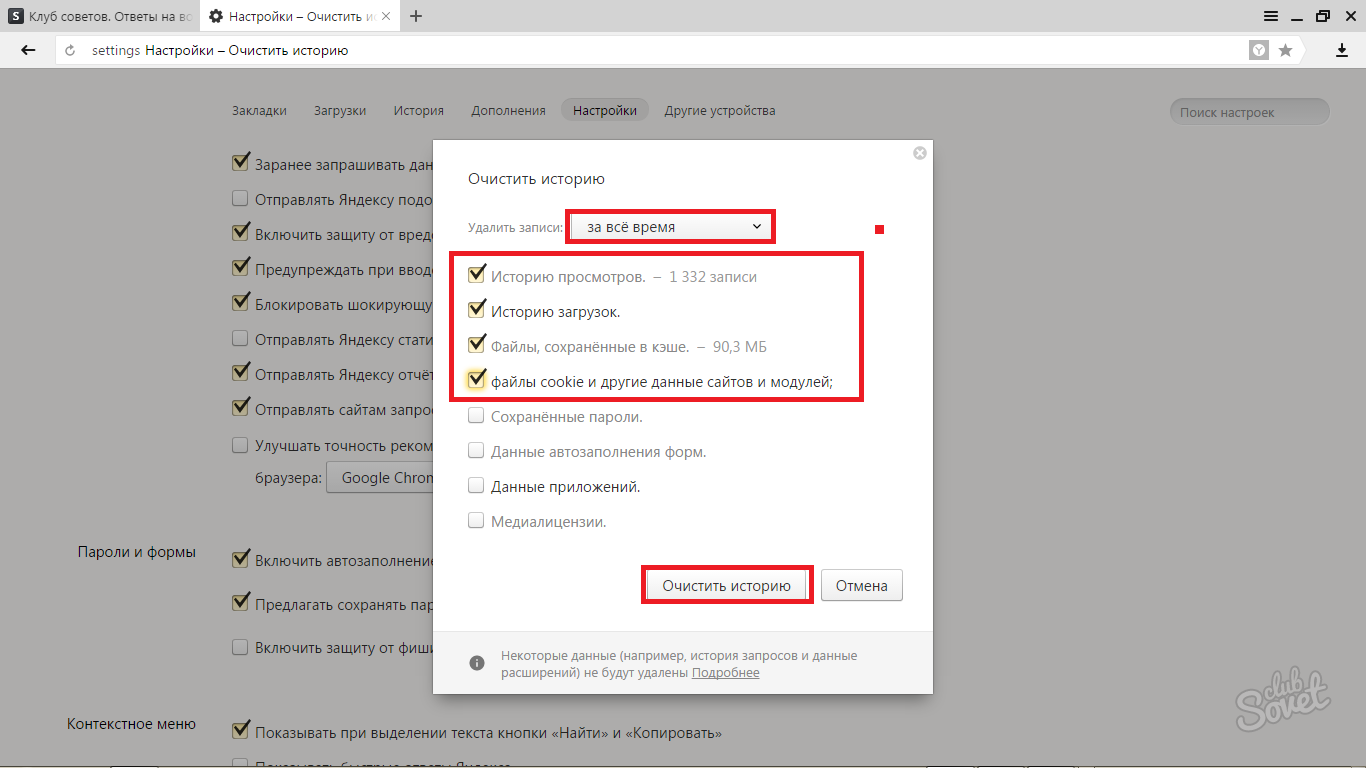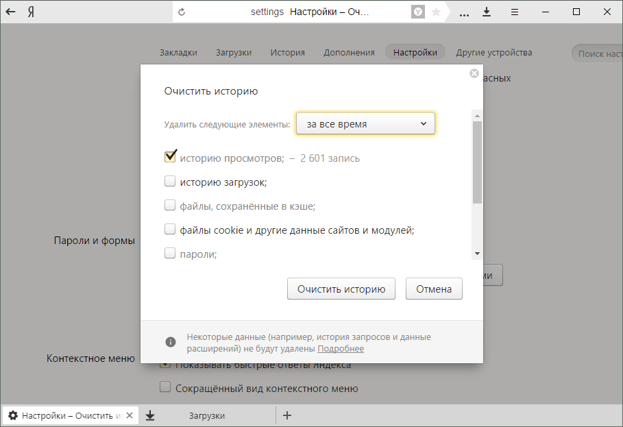 - Очистить историю в браузере Яндексе полностью (включая “Загрузки” и другие хвосты)
