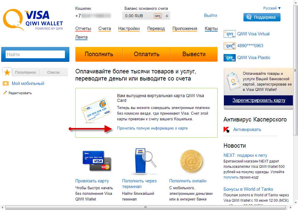 Вывод средств с Qiwi счета на карту Visa Qiwi Plastic