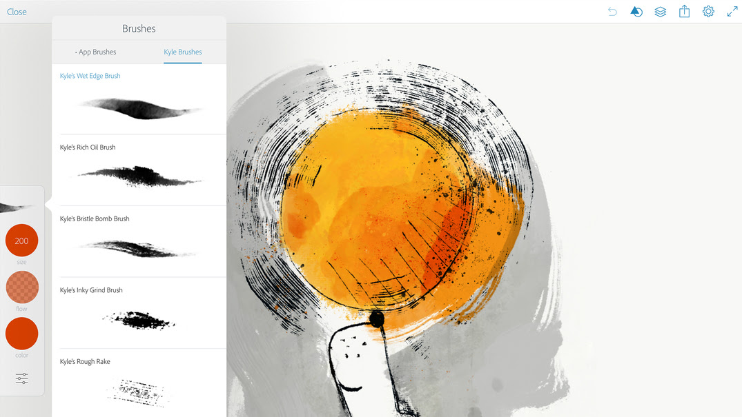 - Поддержка цифрового пера iPad — Творите в Brush с помощью Adobe Ink. Посматривайте эффект настроек чувствительности к нажиму и скорости прямо в процессе создания кисти.