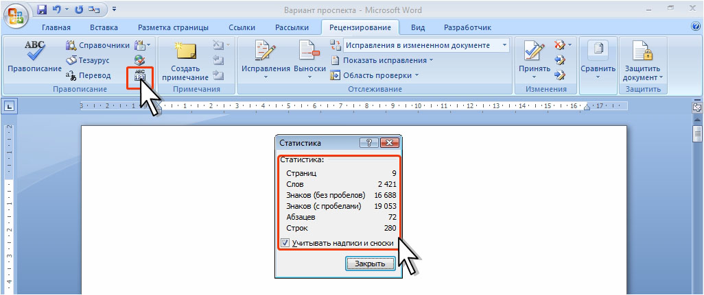 Microsoft Word позволяет узнать и то, сколько всего символов и слов введено в документ с учетом сносок: