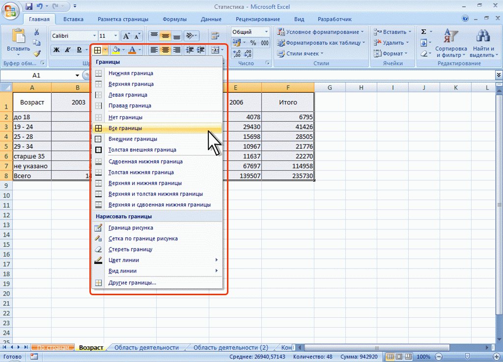 Чтобы добавить границу вокруг каждой ячейки, щелкните и перетащите, чтобы выбрать ячейки, которые вы хотите включить.