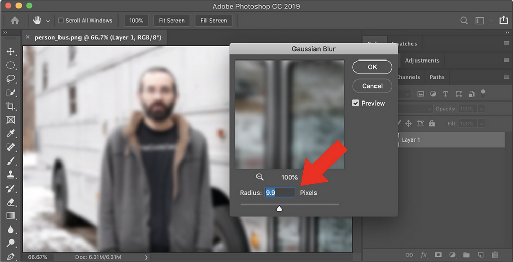 - Появится меню «Размытие по Гауссу» с предварительным просмотром.
