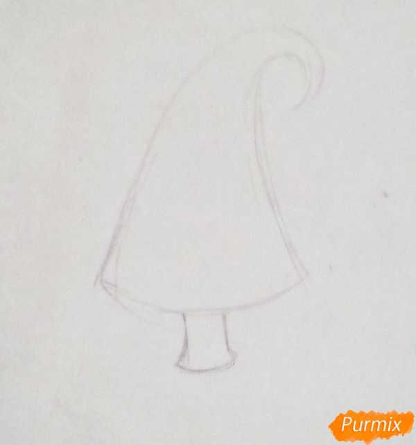 - Рисование начнем с уже знакомого наброска. На бумаге нам нужно изобразить вертикальную линию. От верхней части рисуем треугольник. В нижней части треугольника проводим дугу. Она должна быть размещена так, будто заходит за фигуру и, выходит, с другой её стороны.