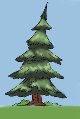 - У ели неокрашенным остался только ствол. Для него потребуется несколько коричневых оттенков и черный. Раскрашиваем ствол начиная с левой стороны. Здесь должен находиться самый светлый цвет, по мере передвижения в правую сторону цвет должен становиться темнее и в конце стать чёрным.