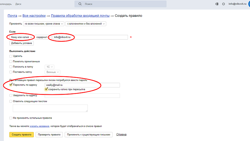 После настройки переадресации её можно протестировать, отправив письмо на необходимый адрес.