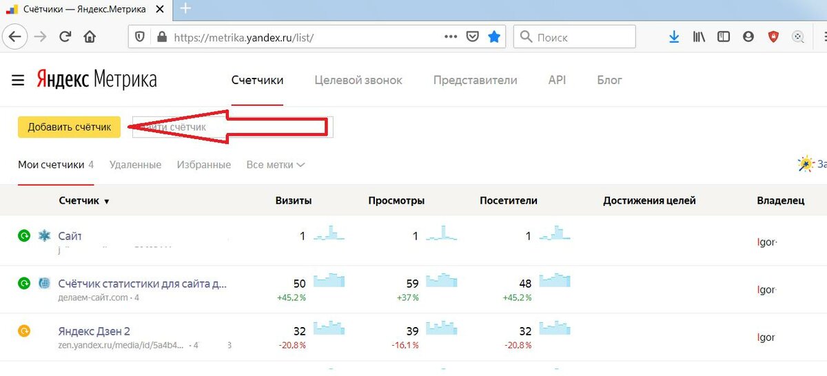 Чтобы установить Яндекс.Метрику, перейдите по ссылке metrika.yandex.ru. Нажмите кнопку добавления счетчика: