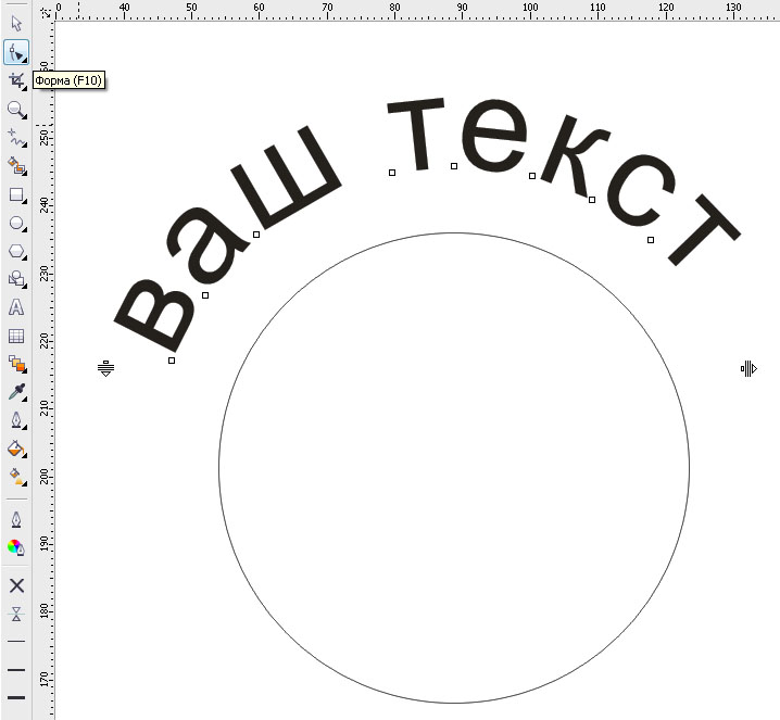 Скольжение влево изгибает текст вверх, скольжение вправо изгибает текст вниз и регулирует размер круга.