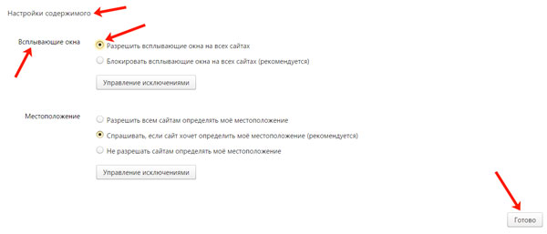 Если функция блокировки включена, а пользователю необходимо ее отключить, то нужно выполнить описанные выше действия и на последнем этапе выбрать в разделе «Всплывающие окна» пункт «Разрешить открытие всплывающих окон…».