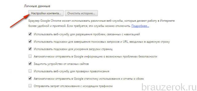 - в этом же окне раскроется меню с дополнительными настройками. В разделе «Личные данные» нужно кликнуть по кнопке с надписью «Настройки контента»: