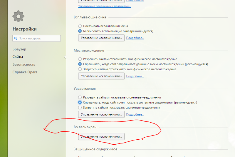 Переходим в раздел «Настройки сайта» в параметрах обозревателя рассмотренным в предыдущей главе способом. Раскрываем область, обозначенную на скриншоте рамкой.