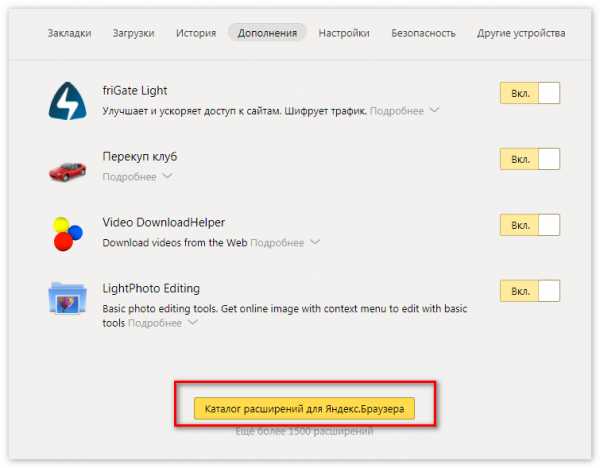 - В окошке веб-обозревателя откройте Меню => Дополнения => Каталог расширений (внизу закладки).