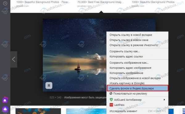 Выбираю окну из картинок и щелкаю по ней правой кнопкой мыши. В открывшемся меню кликаю по «Сделать фоном Яндекс Браузера».