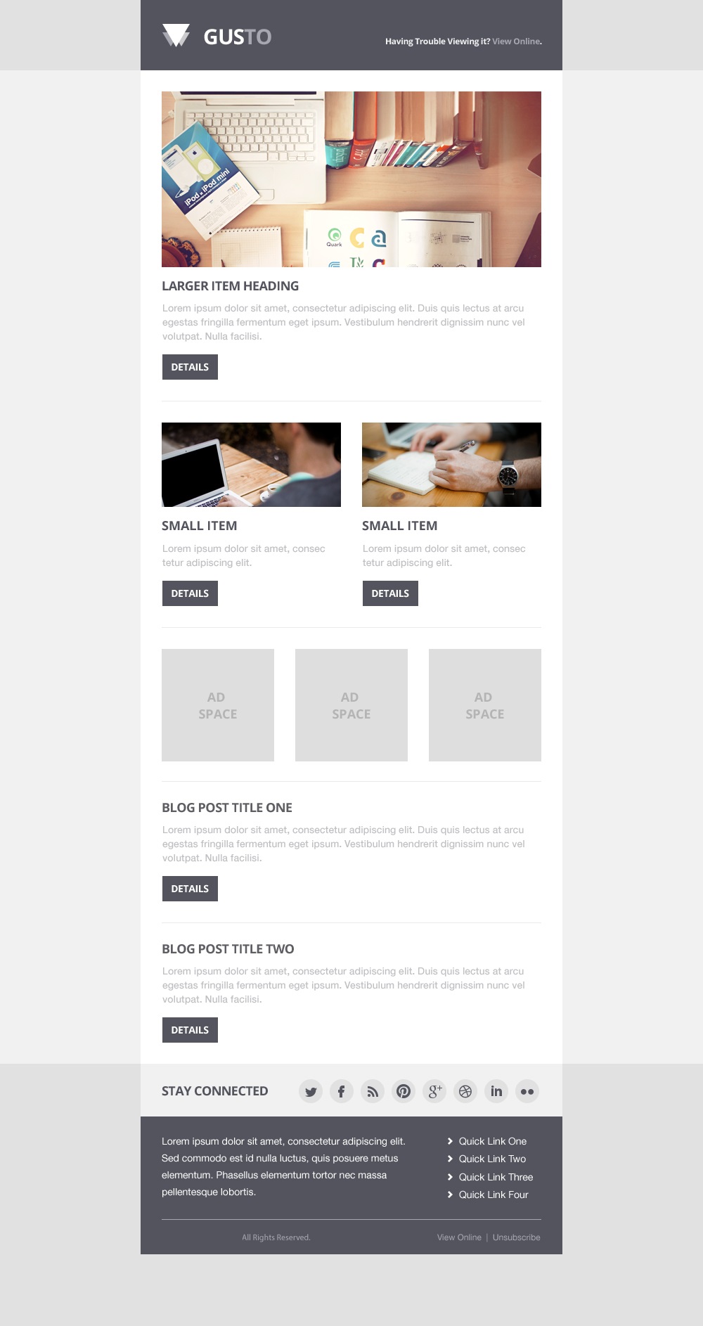 А сейчас я хочу показать вам, что у меня получилось пока, без добавления стилей оформления, таких как шрифт, цвет, размер текста и т.д. Это только элементы в нужных местах. В следующей статье я опишу процесс тестирования в разных почтовых сервиса и правки, которые пришлось внести.