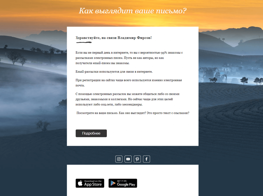 Вот такое письмо получилось. Теперь предстоит куча тестов. Я планирую протестировать верстку в следующих почтовых сервисах и программах: