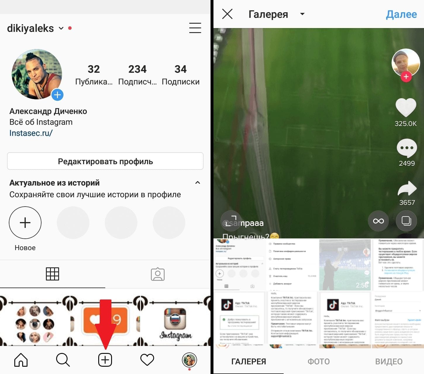 Обратите внимание! Еще один способ выложить сторис — на странице с общей лентой в любом месте провести по экрану слева направо. В таком случае тоже откроется окно, где можно сделать фото и снять видео или выбрать готовую картинку/видеоролик. Это удобно, если вы выкладываете историю повторно, поскольку в таком случае синего плюсика справа внизу у аватарки уже не будет.
