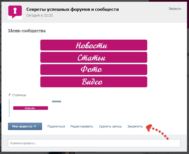 Открыт — это сообщение, которое было исправлено. Есть действующая ссылка на меню. Этот вид еще довольно молодой, появился он не так давно, а точнее с появлением функции крепления поста на стене страницы. Открытое меню на сегодняшний день наиболее эффективно, оно более привлекательно, чем закрытое.Первый вариант менее продуктивен, потому что посетители группы могут просто не заметить ссылку на нее.