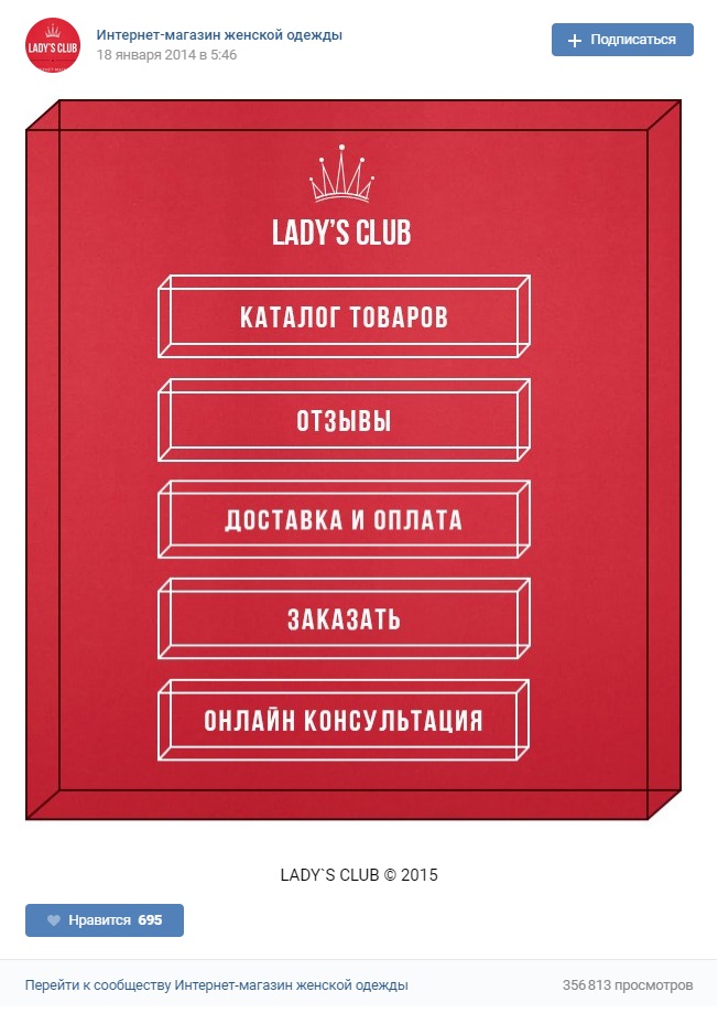 Качественное, красиво оформленное, интерактивное меню является и грамотным дизайнерским решением, и полезным инструментом. Причем пользу оно приносит как посетителям сообщества, так и для маркетологам, задача которых заставить этих посетителей совершать целевые действия.
