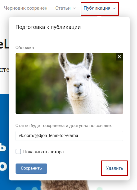 В разделе “Публикация” вы можете загрузить обложку для записи и отредактировать адрес ссылки, по которой будет доступна статья.
