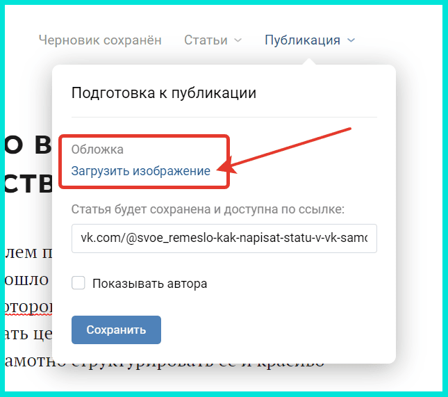 - Добавляем обложку статьи в разделе Публикация в правом верхнем углу. Тут же будет автоматически создана ссылка на статью.