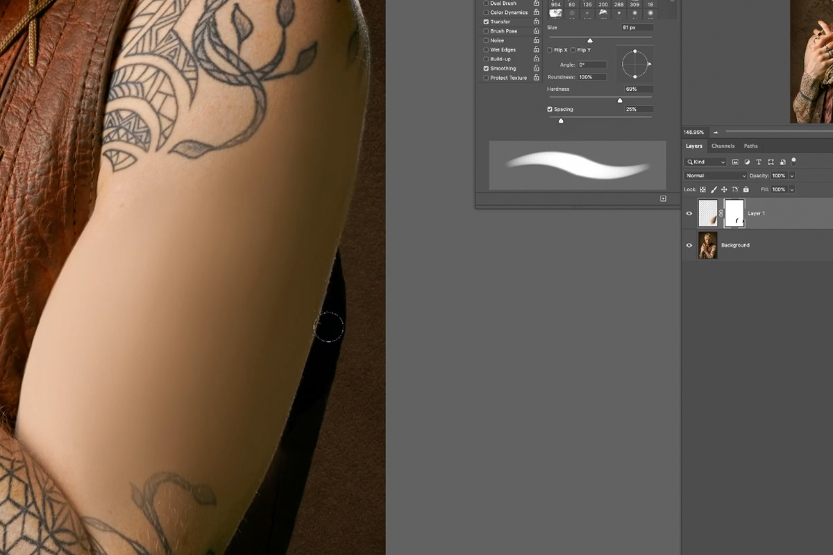 Если вы хотите удалить какую-либо текстуру с части вашей основной фотографии (обычно с чего-то вроде кожи), для этого есть несколько продвинутых методов. Шаг 6а поможет вам одновременно удалить текстуру и ее цвет. Если вы предпочитаете удалить только текстуру, но сохранить ее цвет, что обычно приводит к более четкому переходу между текстурированной и нетекстурированной частями изображения, перейдите к шагу 6b.