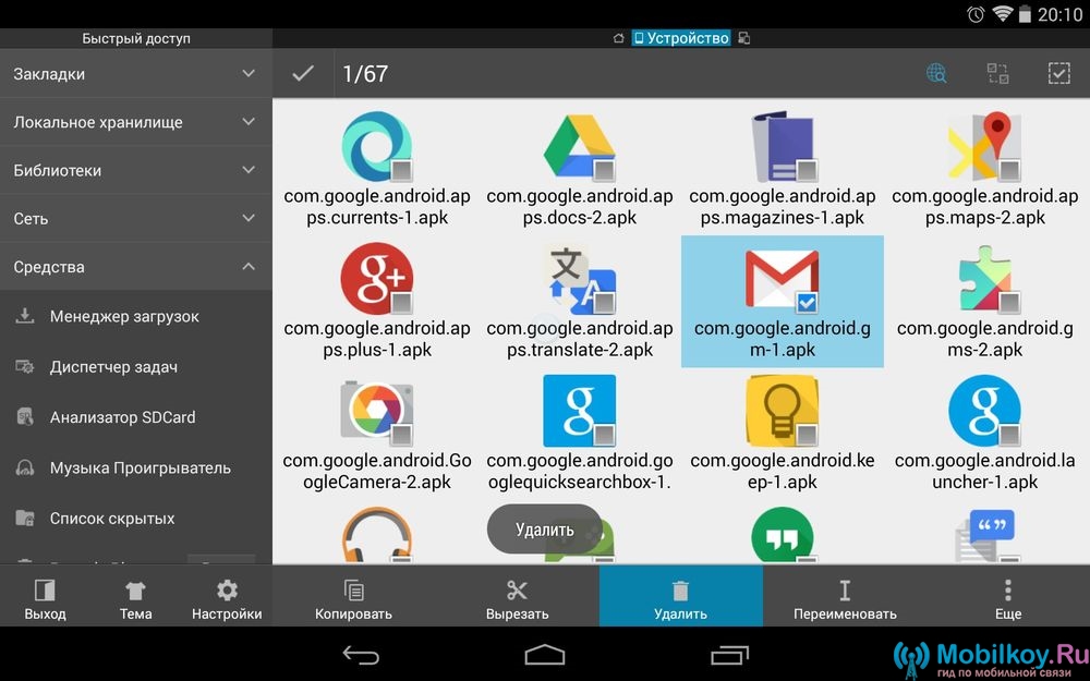 3. Выберите .apk файл нужного приложения и в появившемся контекстном меню нажмите «Удалить».