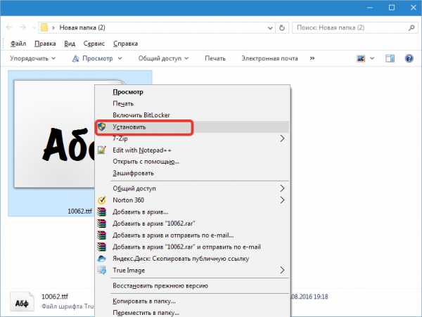 Вариант 1. Открываем файл со шрифтом – вверху есть кнопка Установить. Нажимаем ее – шрифт попадает в системную папку и становится доступным для всех текстовых редакторов.
