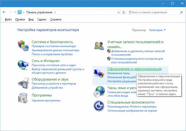 - Заходим в «Панель управления» из меню «Пуск» и выбираем пункт «Оформление и персонализация».
