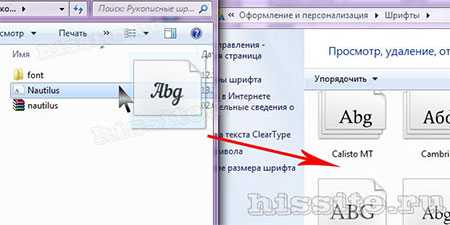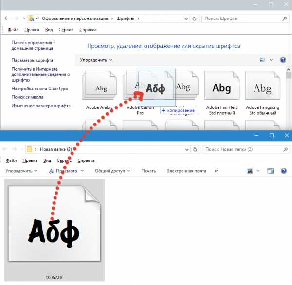 Перетаскиванием. Рядом с папкой Fonts открываем папку со шрифтами. Выделяем нужный файл или несколько, зажимаем мышкой и тянем в Fonts.